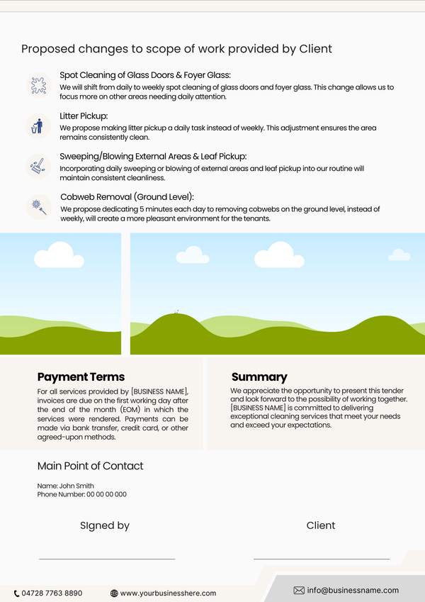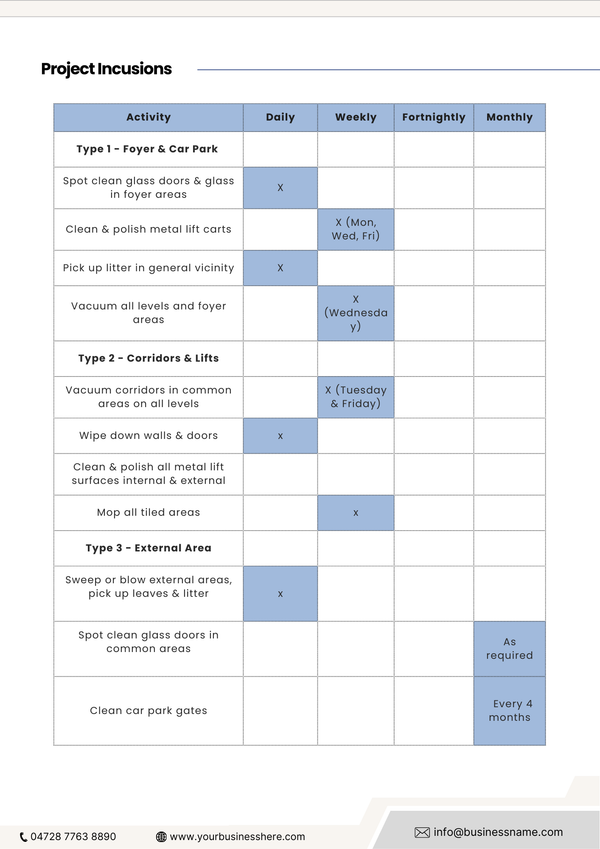 Consistent editable formats help clients clearly understand scope frequency and pricing