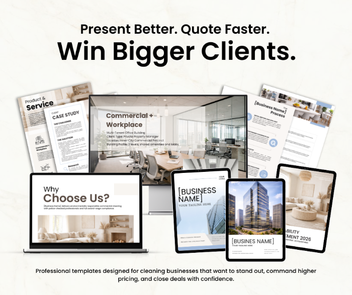 Our done-for-you cleaning business templates are designed to help you present like the professional you are, win higher-value clients, and run your business with less stress.